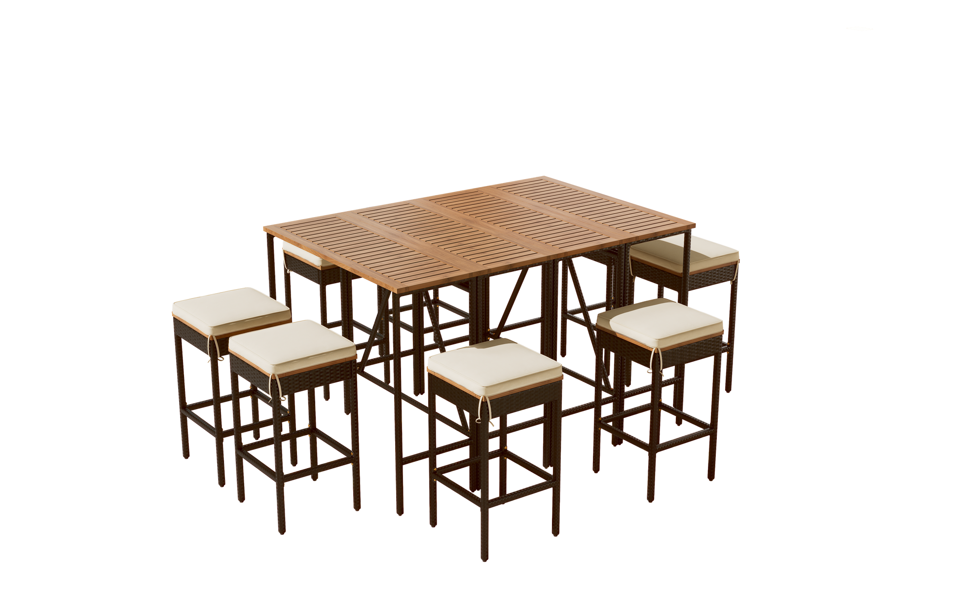10-teiliger Outdoor-Bartisch aus Akazienholz mit acht gepolsterten Hockern, braun