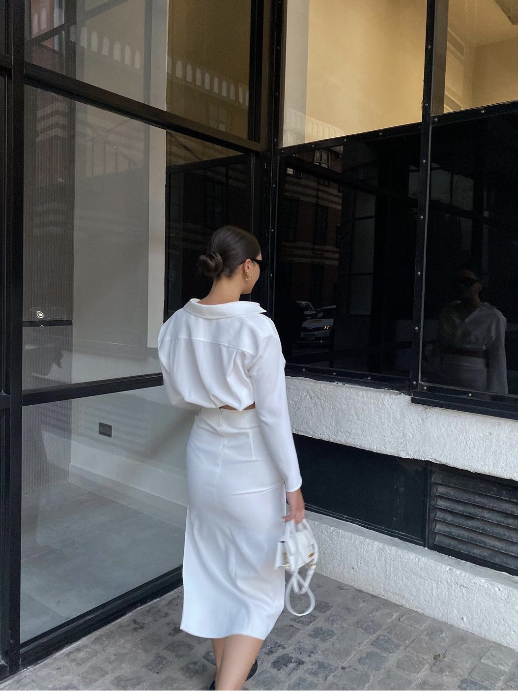 Sexy und dezent verpackt in einem schönen Outfit. Tragen Sie den weißen mittelhohen Rock mit Schlitz und das verkürzte Langarm-Set, während Sie am Strand herumhängen, in der Stadt essen oder einfach nur einen Tag mit Freunden verbringen.