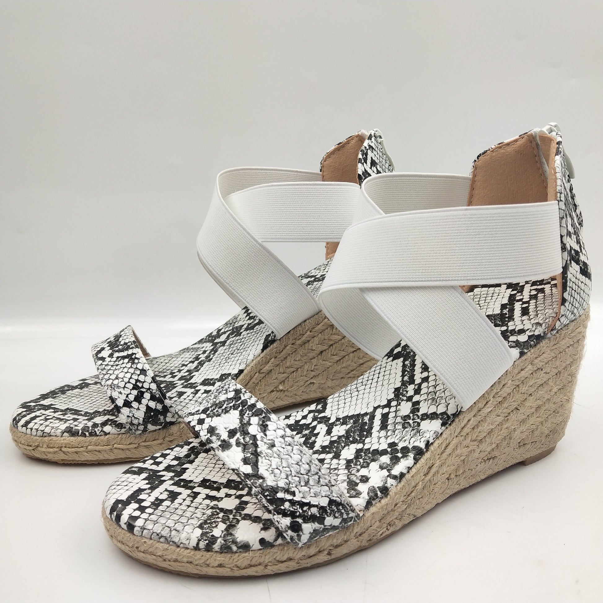 Brauner Leopardenmuster und schwarze Riemen, kurzer Keilabsatz mit Schlangenmuster in Grau, rosafarbener Mikrofaser oder orangefarbenem Leopardenmuster und zusätzliche Polsterung für eine bequeme Sommersandale.