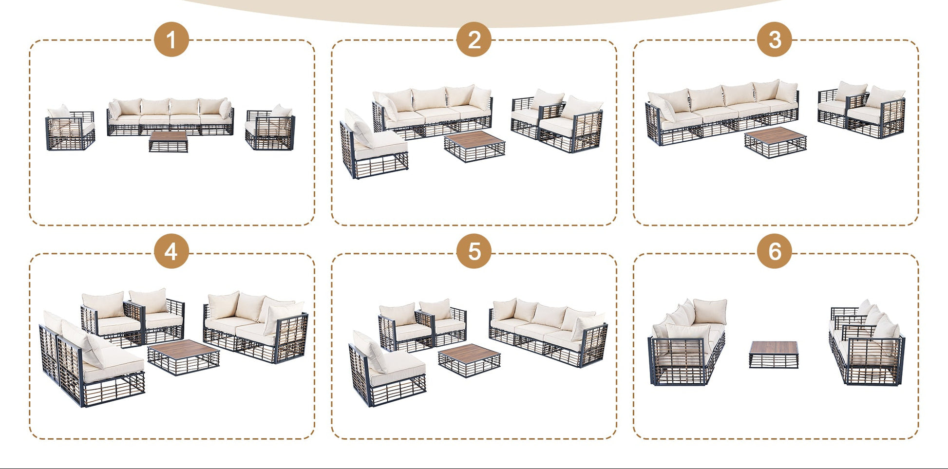 - [Free Combination Sofa Set] Envision a sophisticated ensemble that adapts effortlessly to your spatial requirements and aesthetic inclinations. This refined collection—featuring 2 corner sofas, 2 armless sofas, 2 arm sofas, and an elegant coffee table—transforms your outdoor sanctuary into a canvas for entertaining excellence. Whether orchestrating grand social gatherings or designing intimate retreats for personal repose, this versatile arrangement empowers you to curate your exterior living space with precision, offering a distinguished and adaptable enhancement to your environment.