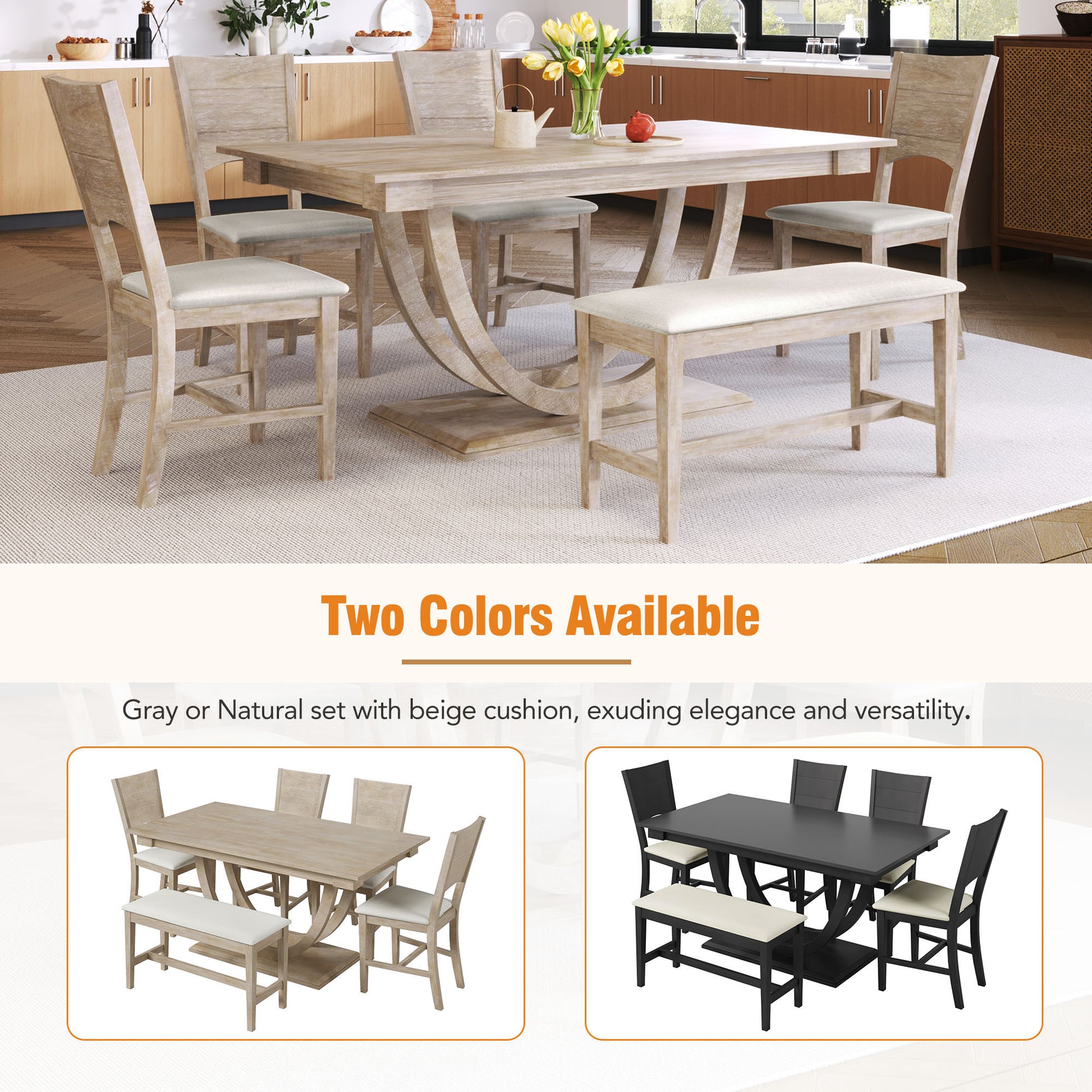 - [Juego de comedor moderno para 6] Experimente una combinación armoniosa de diseño moderno y tradicional con nuestro juego de comedor de madera maciza de 6 piezas. Esta colección consta de una mesa rectangular, cuatro sillas y un banco, todos ellos distinguidos de forma única por sus patas de mesa semicirculares. Cada silla y banco está lujosamente acolchado, ofreciendo comodidad y estilo. Ideal para alojar hasta seis personas, este juego eleva su espacio de comedor y destaca en cualquier interior.