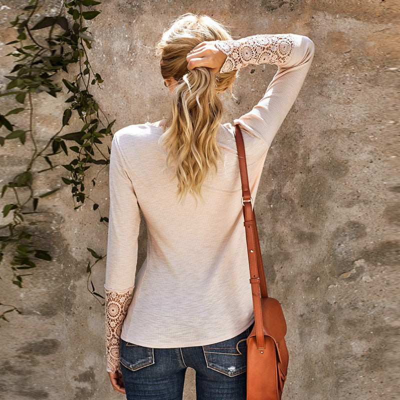 Camisa de manga larga con cuello en V, botones y canalé con detalle de encaje en las mangas.