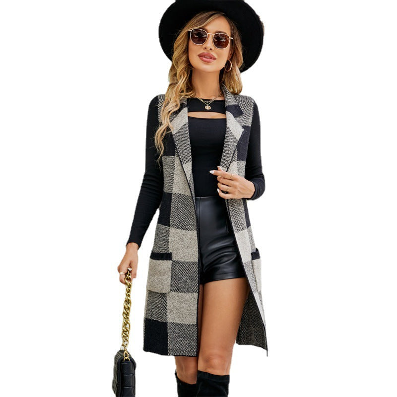 Cárdigan hasta la rodilla con cuello de solapa a cuadros