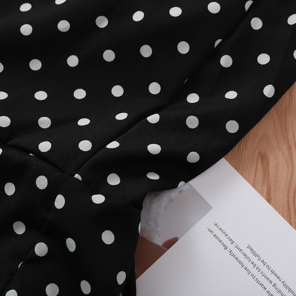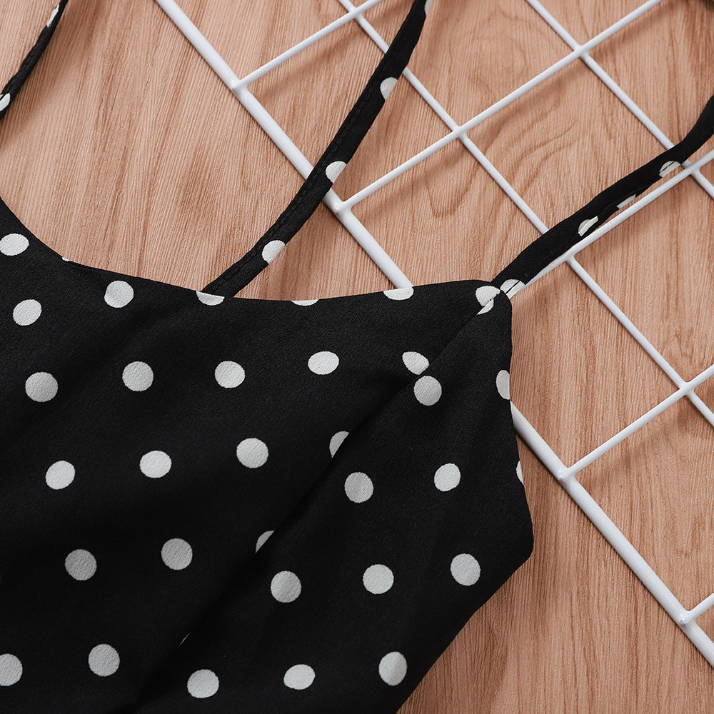 Vestido informal con tirantes y lazo en forma de corazón de lunares con abertura delantera. Se vende en negro, azul, rojo y marrón.
