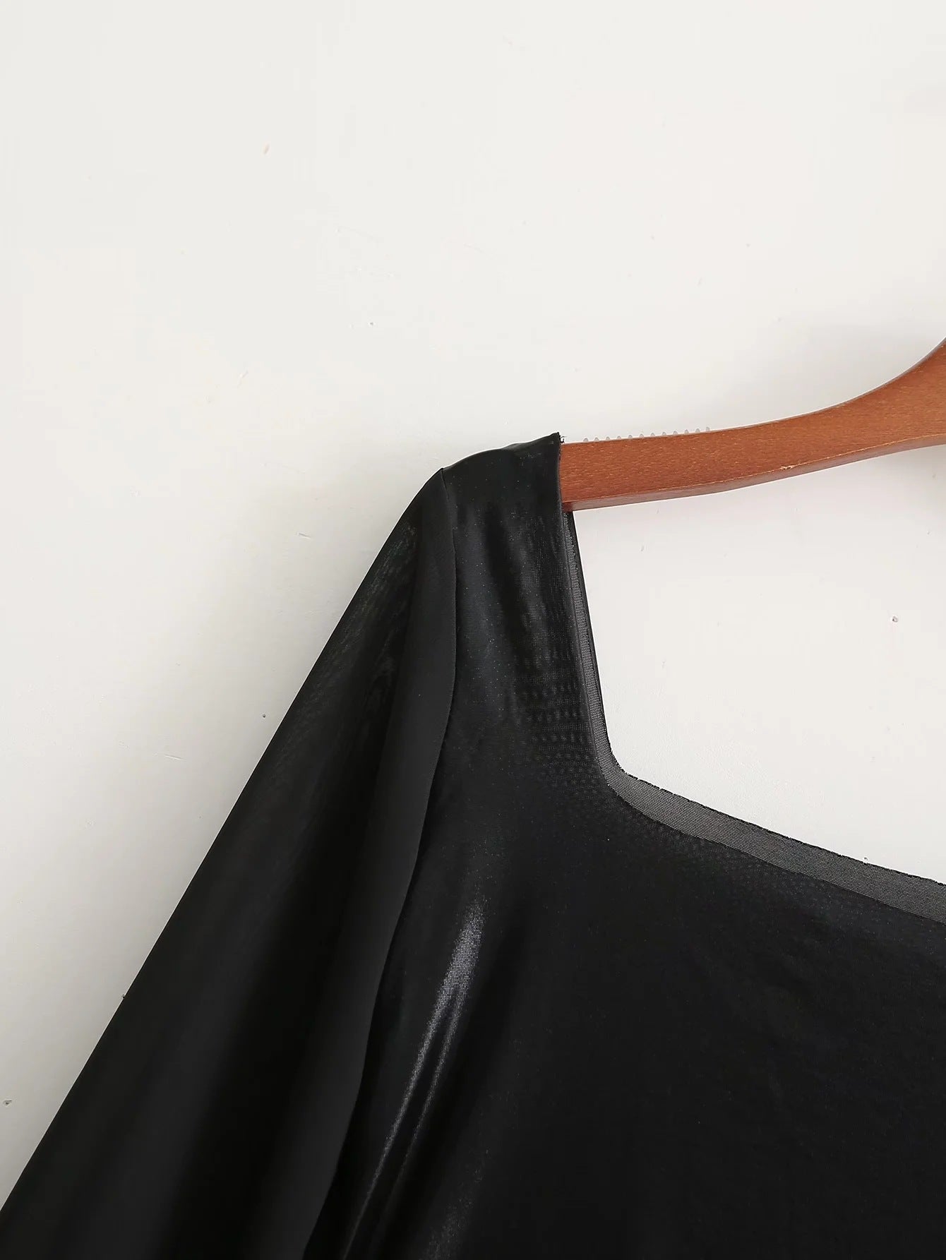 Camisa tipo body de cuero PU con brazo de malla y mangas acampanadas para mujer
