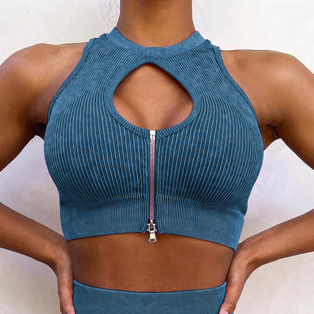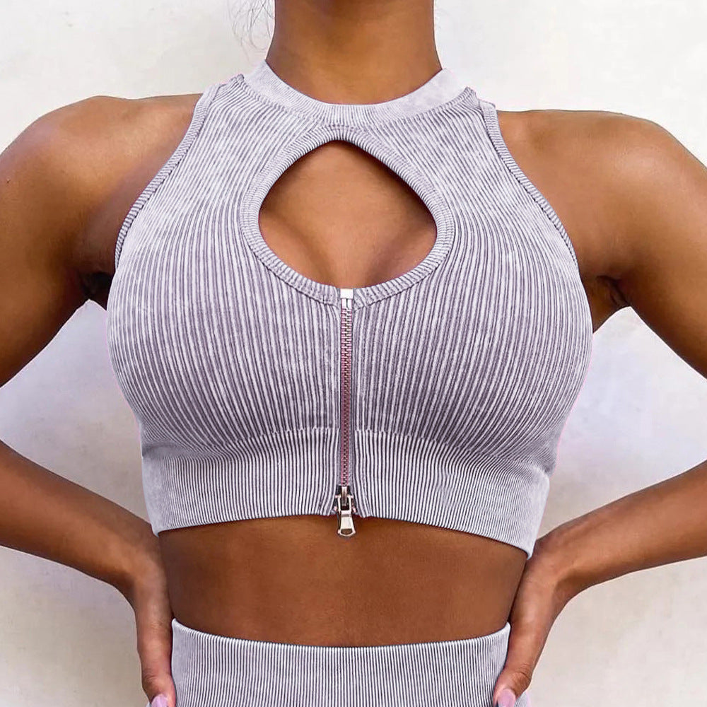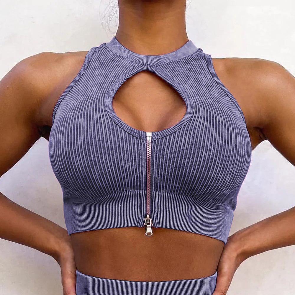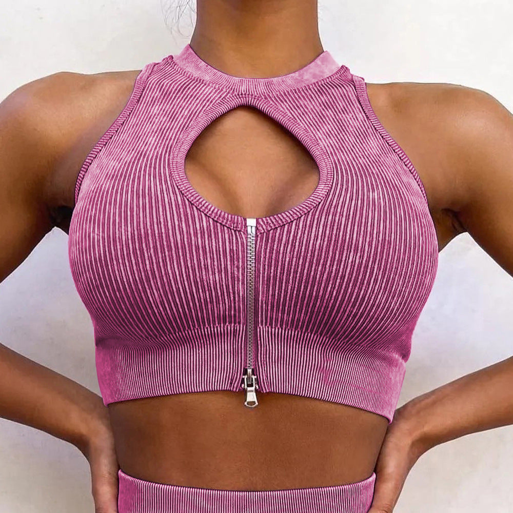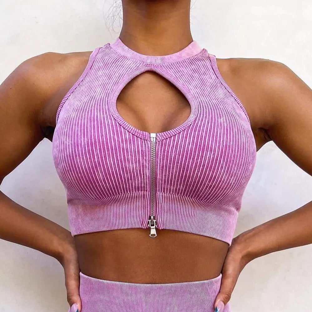 Peekaboo zip front sports bra pair with matching shorts to make a set. Great for active lifestyles.