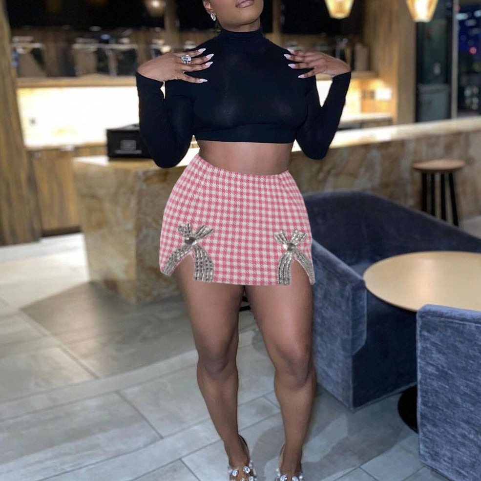 Embrace your adventurous side with our Rhinestone Barbie Skirt. This skirt features a stunning woven houndstooth pattern that will have you standing out from the crowd. The rhinestone details add a touch of glamour, perfect for making a statement at your next event. So take a risk and rock this bold and unique skirt today!