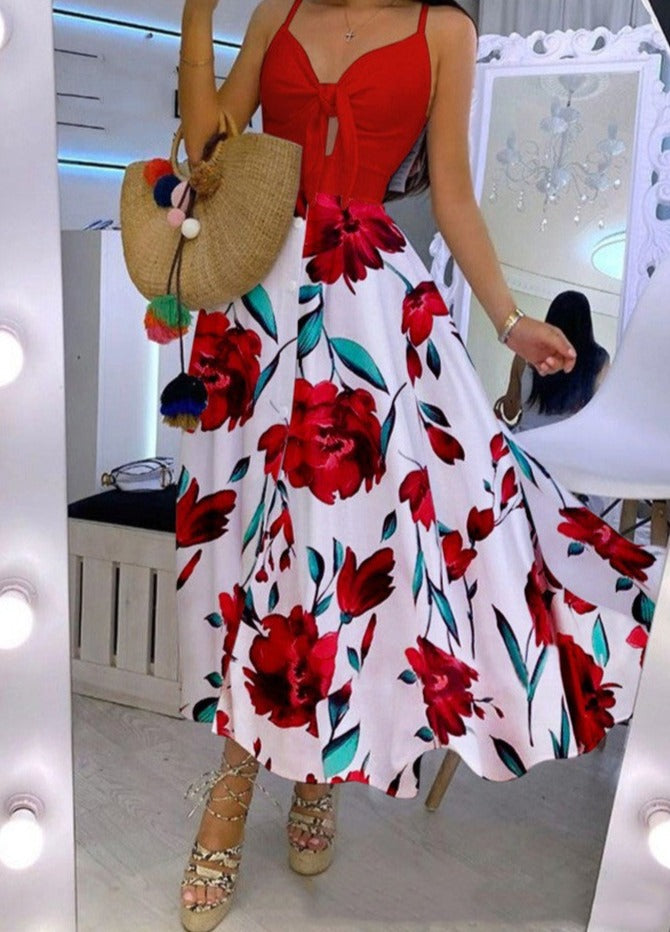 Lovely Summer Midi Dress with under bust cutout and tie with decorative buttons down the middle of the skirt. Sold in white, pink, black, red rose print, black and white feather print, and peacock print.