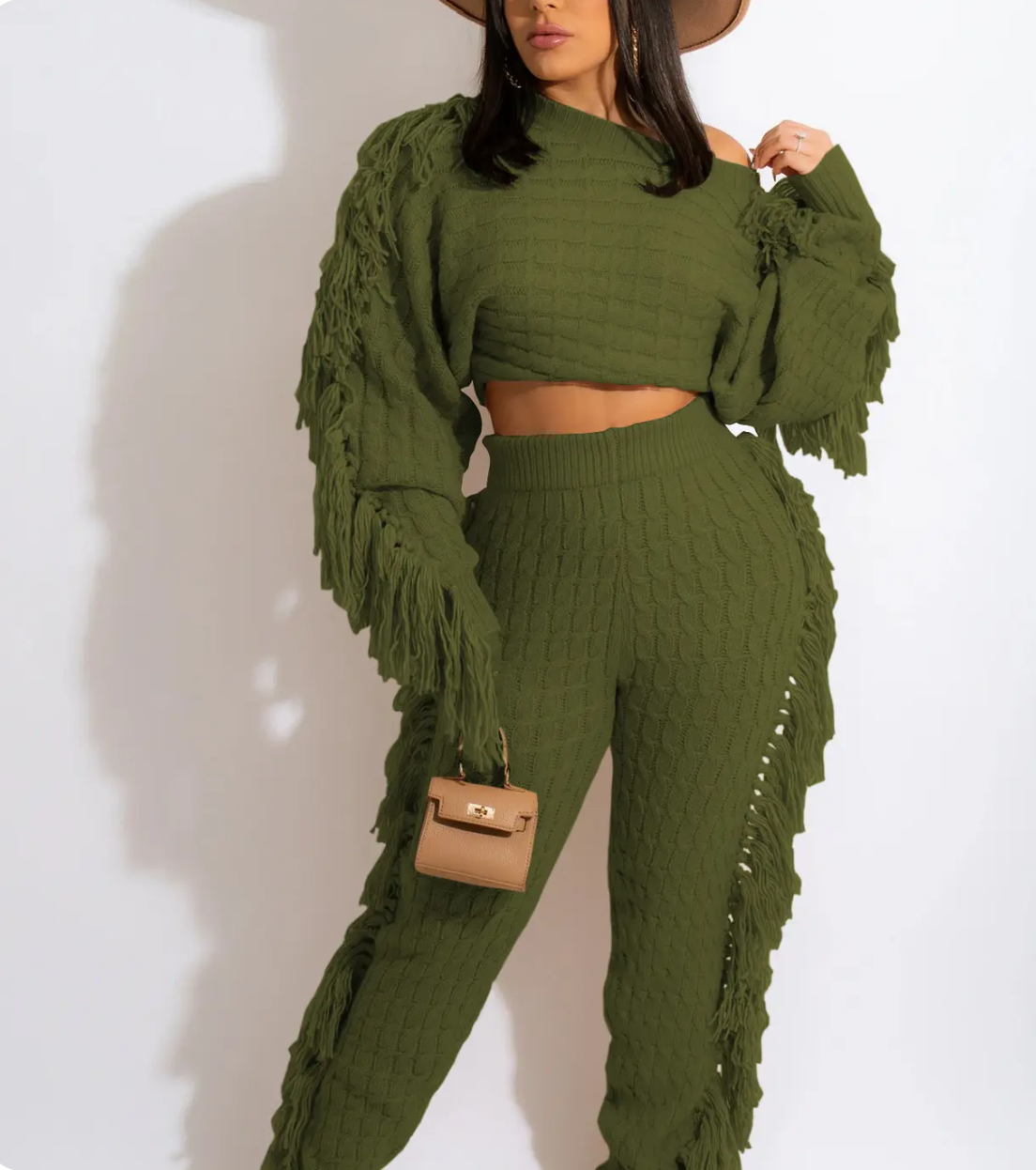 Stay warm and fashionable this winter in our Tassel Long Sleeve Sweater 2 Piece Set. Crafted from luxurious materials and featuring intricate tassel detailing, this exquisite set adds a chic, couture-inspired look to any wardrobe.